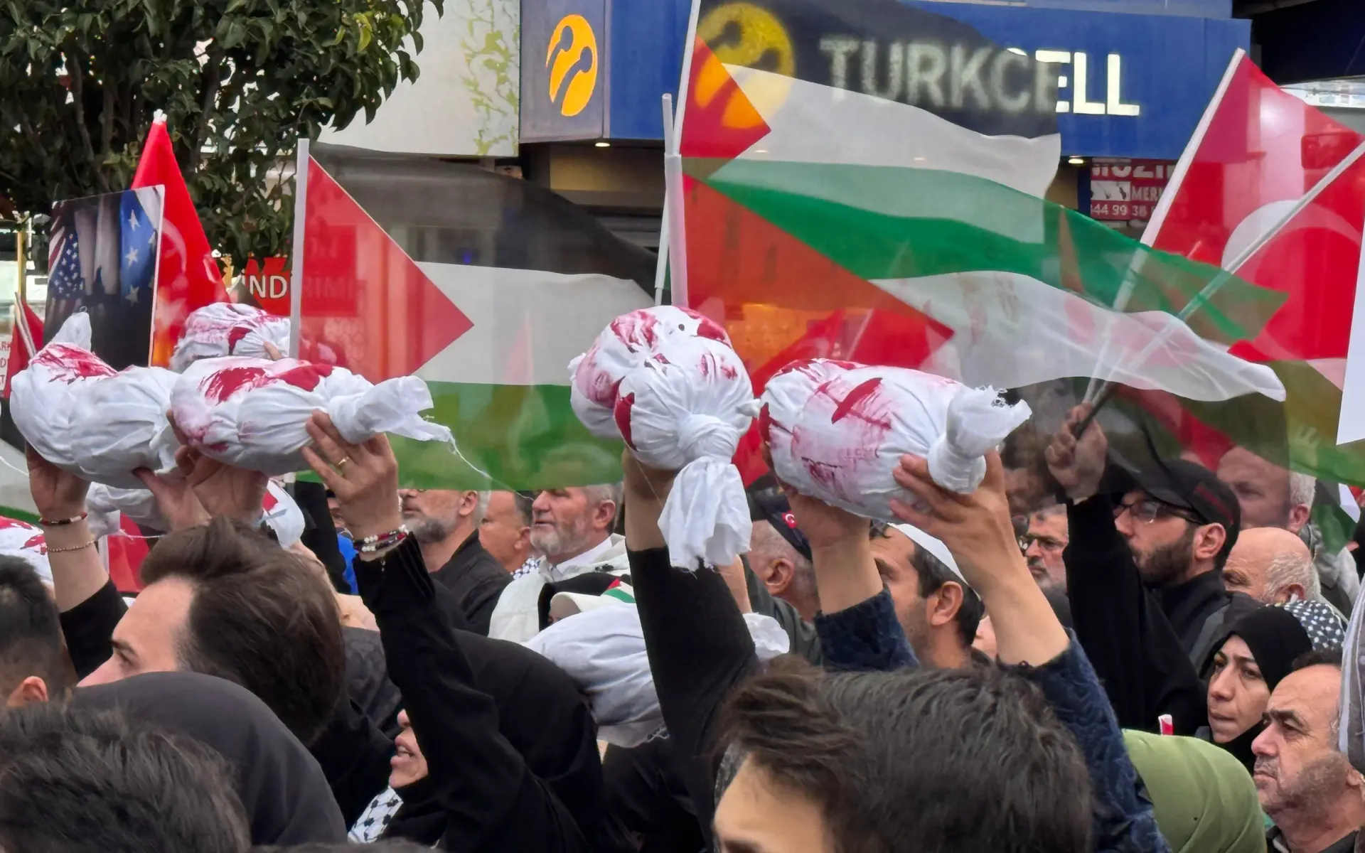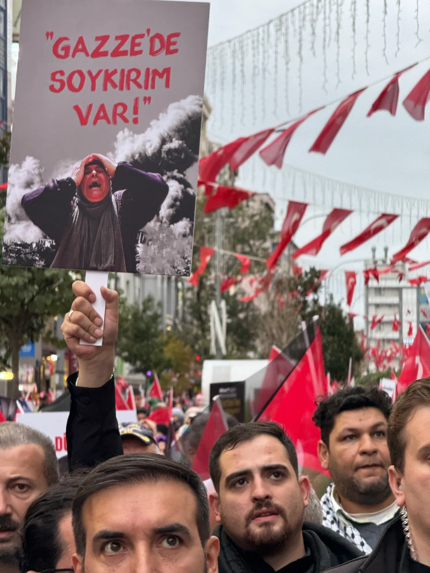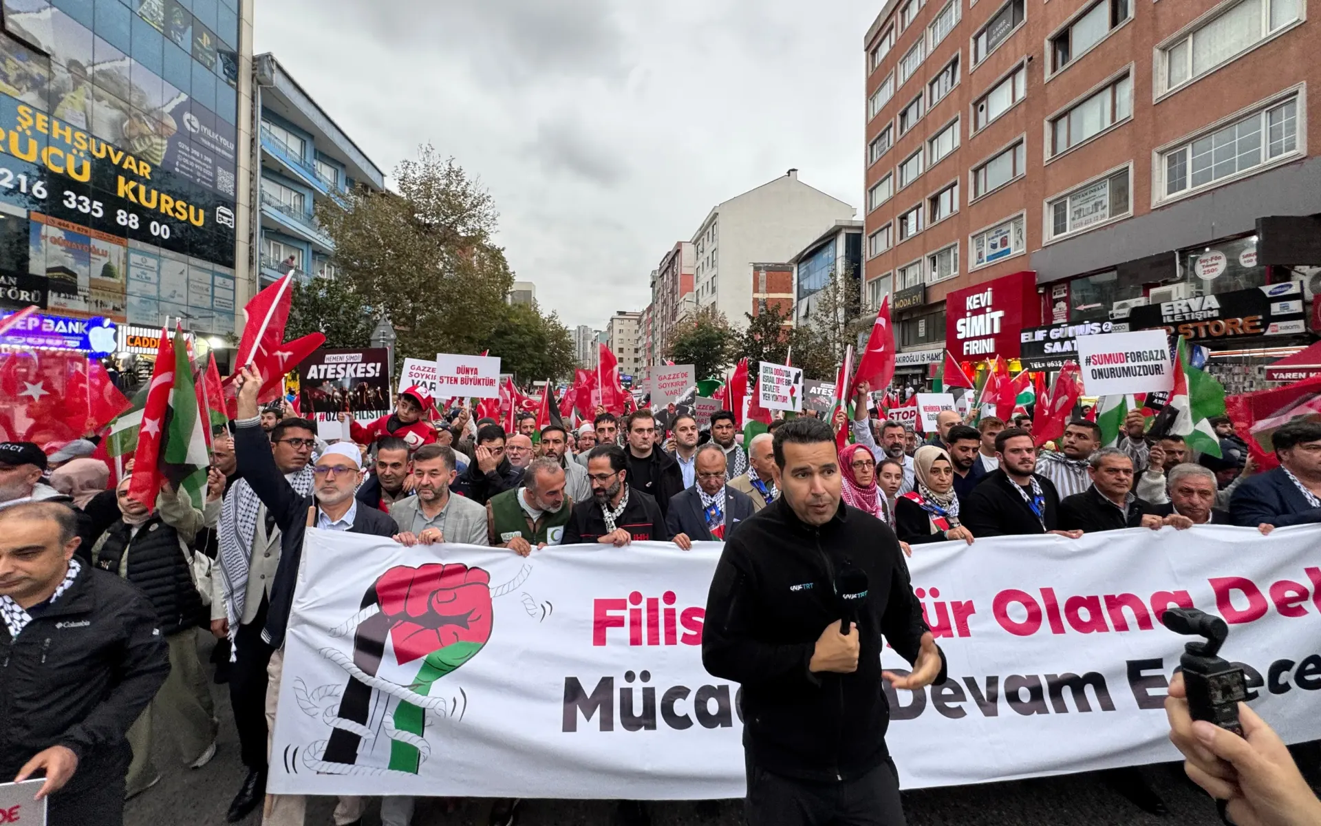 Ellerinde Türk ve Filistin bayrakları taşıyan binlerce kişi, ‘’Nehirden denize özgür Filistin’’, ‘’ Zulme sessiz kalma’’, ‘’ Gazze yalnız değildir’’ gibi sloganları attı.